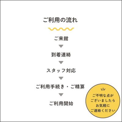 - ご利用当日は、施設にご到着後、施設入り口に掲示しております連絡先までお電話をお願いいたします。